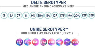 CAPVAXIVE® (PKV21) er indisert for aktiv immunisering for å forebygge invasiv sykdom og pneumoni forårsaket av Streptococcus pneumoniae hos personer fra 18 år og oppover.1