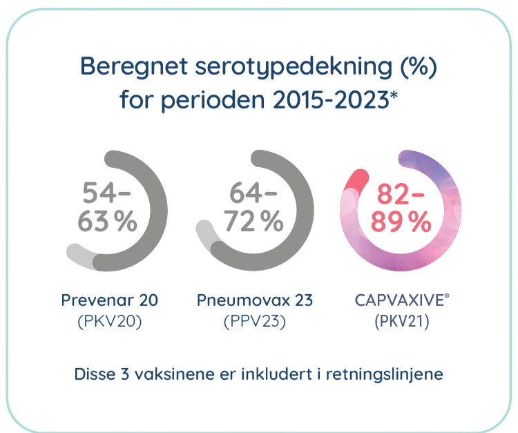 *Verdien er basert på epidemiologiske data fra Berild et al. (2025) og gjenspeiler ikke effekten til de respektive vaksinene. Det finnes for øyeblikket ingen studier som sammenligner effekten til CAPVAXIVE® (PKV21), Prevenar 20 (PKV20) og Pneumovax 23 (PPV23).2