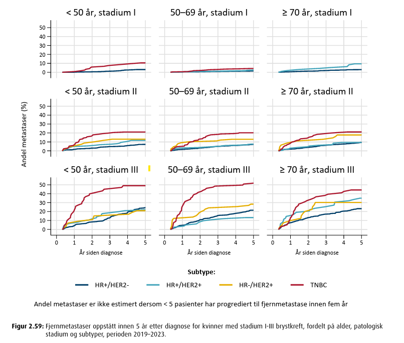 Pasienter med HER2- positiv brystkreft har best 10 års relativ overlevelse. Det forventes at resultater for metastaser og overlevelse for TNBC pasienter vil bli forbredet over tid, på grunn av økende bruk av neoadjuvant behandling, tilpasset adjuvant kjemoterapi og bruk av immunterapi i neoadjuvant setting. På grunn av nye behandlinger forventes også en bedring for andre subtyper av brystkreft.