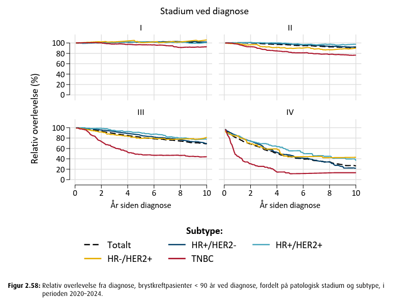 Årsrapporten for brystkreft i 2024 viser estimert 10 års relativ overlevelse fordelt på alle subtyper og stadium. Pasienter med TNBC har lavest 10 års relativ overlevelse uavhengig av stadium, men stadium ved diagnosetidspunkt spiller en stor rolle for prognose.