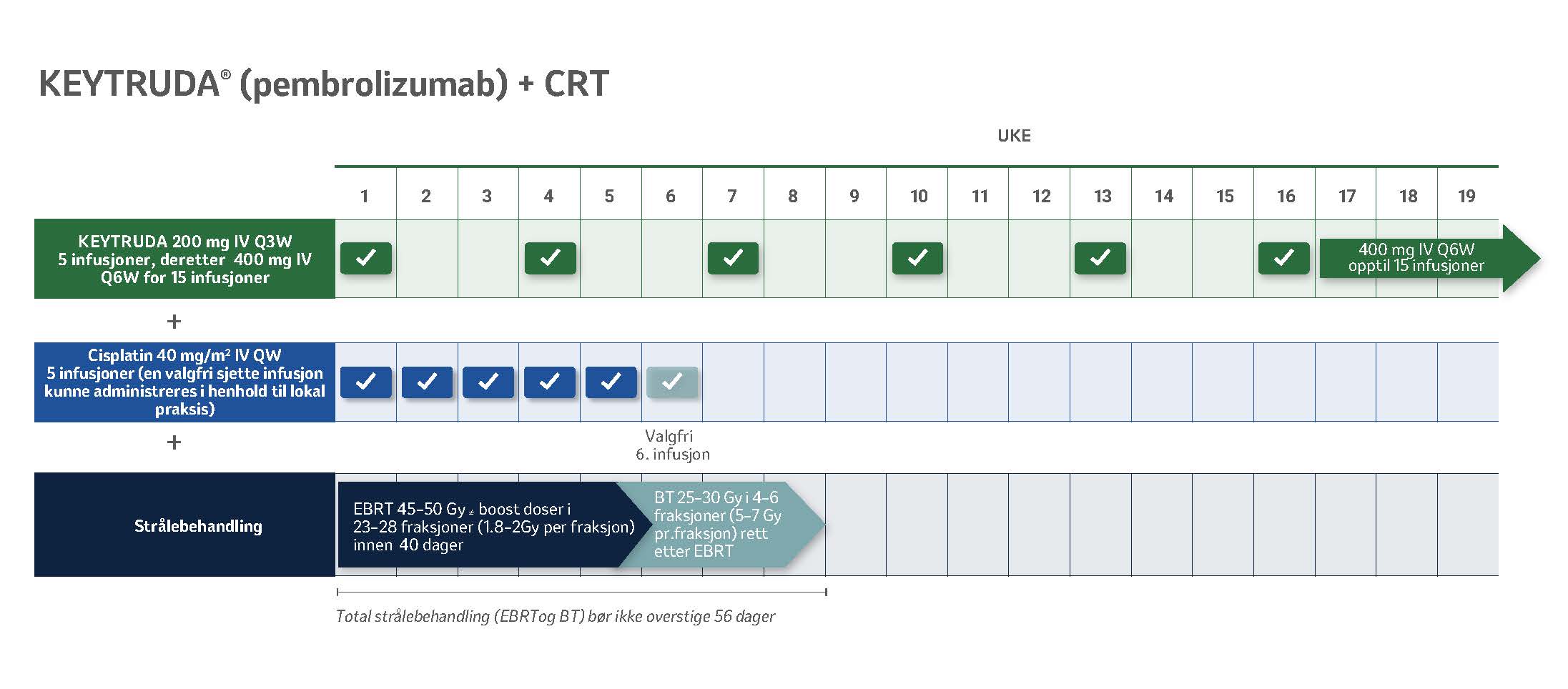 KEYTRUDA® kan gis hver 3. eller 6. uke. Les mer om dosering her: Keytruda – Dosering | MSD Innsikt.