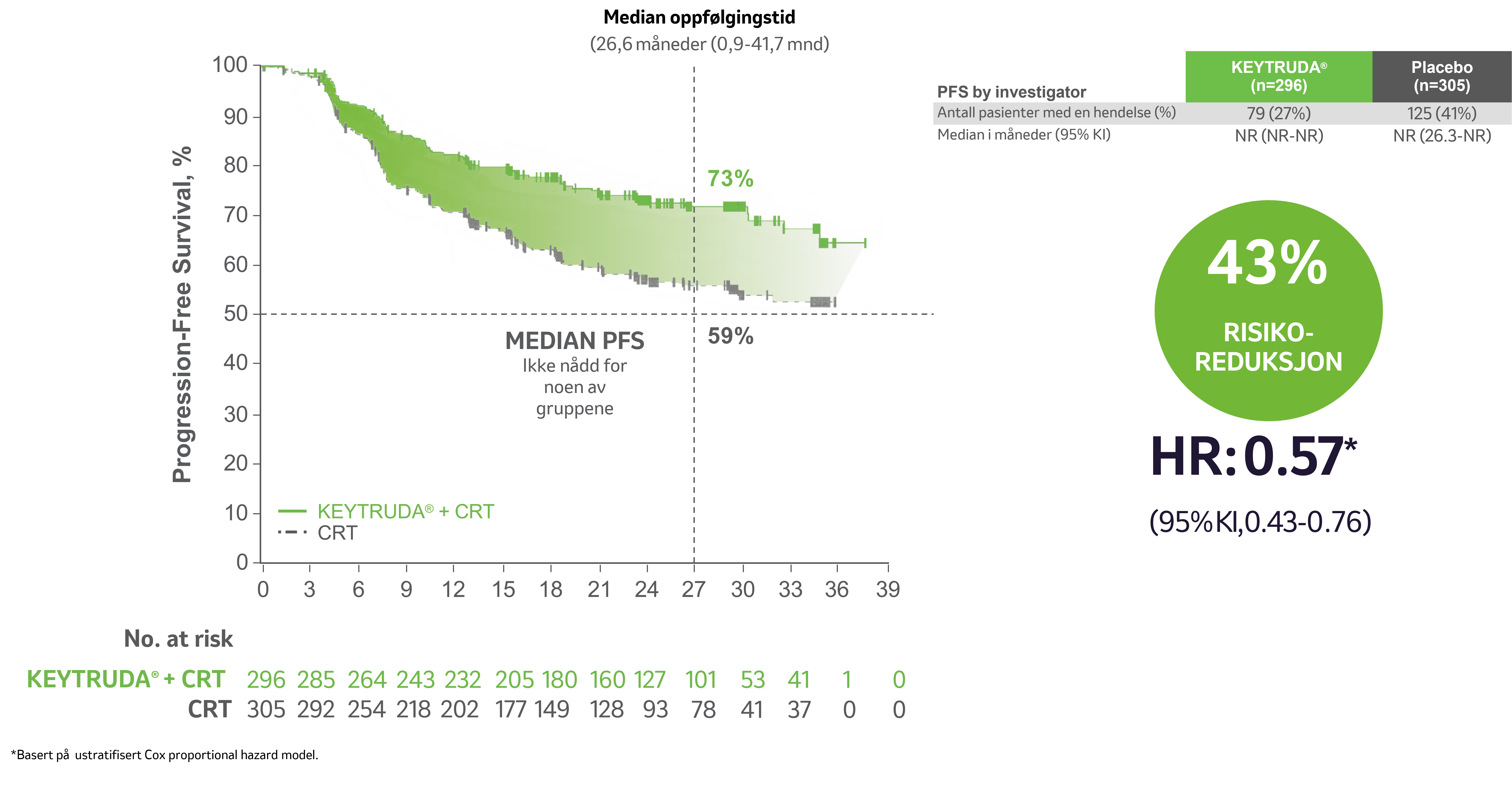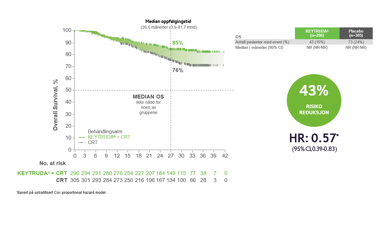 De primære effektendepunktene var progresjonsfri overlevelse (PFS) basert på utprøvers vurdering i henhold til RECIST v1.1 eller histopatologisk bekreftelse, og total overlevelse (OS). Studien viste statistisk signifikante forbedringer i progresjonsfri overlevelse fra den første pre-spesifiserte interimanalysen og total overlevelse fra den andre pre-spesifiserte interimanalysen i den totale populasjonen hos pasienter randomisert til pembrolizumab sammen med kjemoradioterapi (CRT) sammenlignet med placebo sammen med CRT: