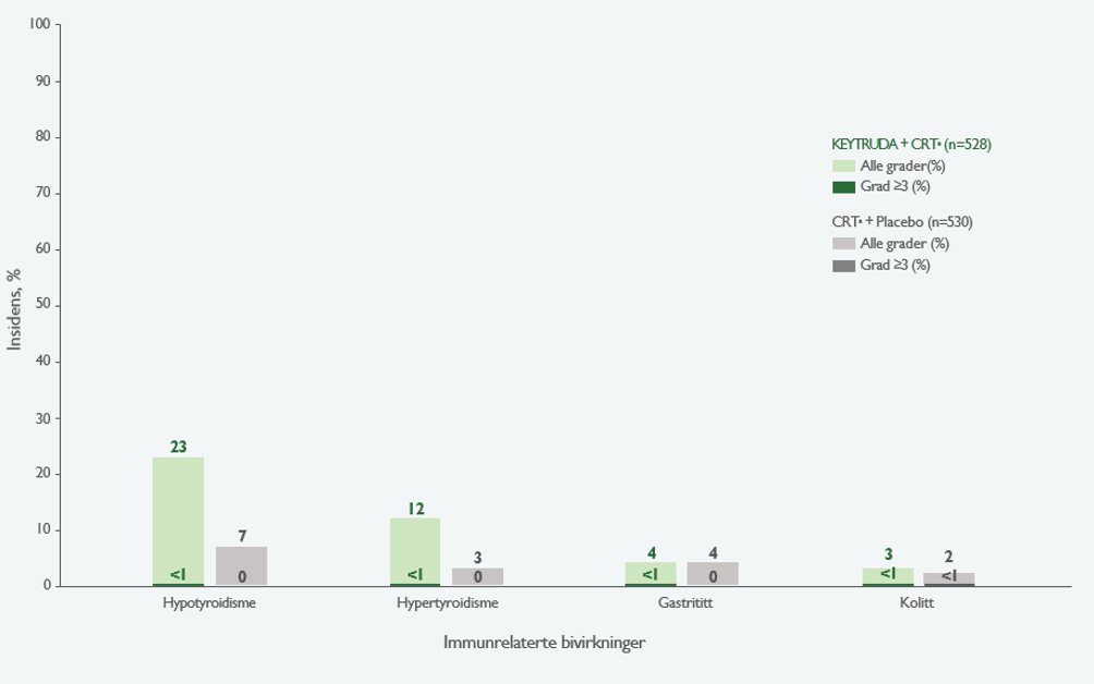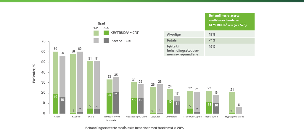 aGradert i henhold til NCI CTCAE v5.0. b Behandlingsrelaterte medisinske hendelser var hendelser som ble tilskrevet et av utprøvningslegemidlene av utprøverne. Behandlingsrelaterte medisinske hendelser som oppstod hos minst 20 % av pasientene i en av behandlingsarmene ble rapportert. Hendelsene er listet i synkende rekkefølge etter hyppighet i KEYTRUDA®–kjemoradioterapi-armen. Pasienter kan ha hatt mer enn én hendelse. Grad 5 behandlingsrelaterte medisinske hendelser var immunmediert gastritt (n=1) og perforasjon av tykktarmen (n=1) i KEYTRUDA®–kjemoradioterapi-armen, og benmargsvikt (n=1) og neutropen kolitt (n=1) i placebo–kjemoradioterapi-armen1