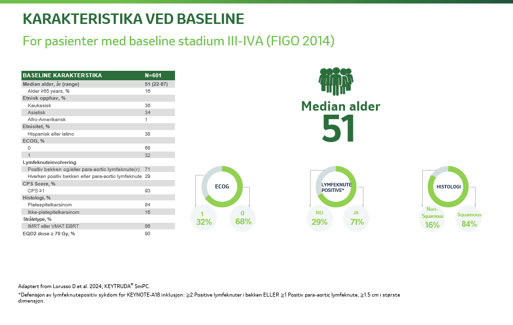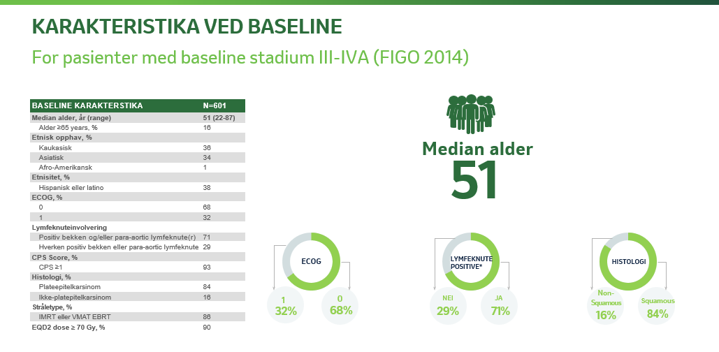 601 pasienter med FIGO (International Federation of Gynaecology and Obstetrics) 2014 stadium III – IVA (tumor involverer den ytre delen av vagina med eller uten utbredelse til bekkenveggen eller hydronefrose/ikke-fungerende nyre eller som har spredd seg til tilstøtende organer i bekkenet) med enten lymfeknutepositiv- eller lymfeknutenegativ sykdom.