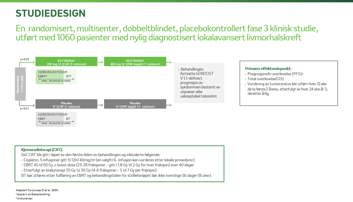 KEYNOTE-A18 (KN-A18) er en randomisert, dobbeltblindet, placebokontrollert multisenterstudie hvor det ble undersøkt effekten av pembrolizumab i tillegg til cisplatin og strålebehandling hos pasienter med lokalavansert livmorhalskreft, hvor progresjonsfri overlevelse som vurdert av utprøver ihht RECIST 1.1 eller histopatologisk bekreftet og totaloverlevelse var de primære endepunktene3. På denne siden kan du lese mer om KN-A18 og resultatene fra studien.