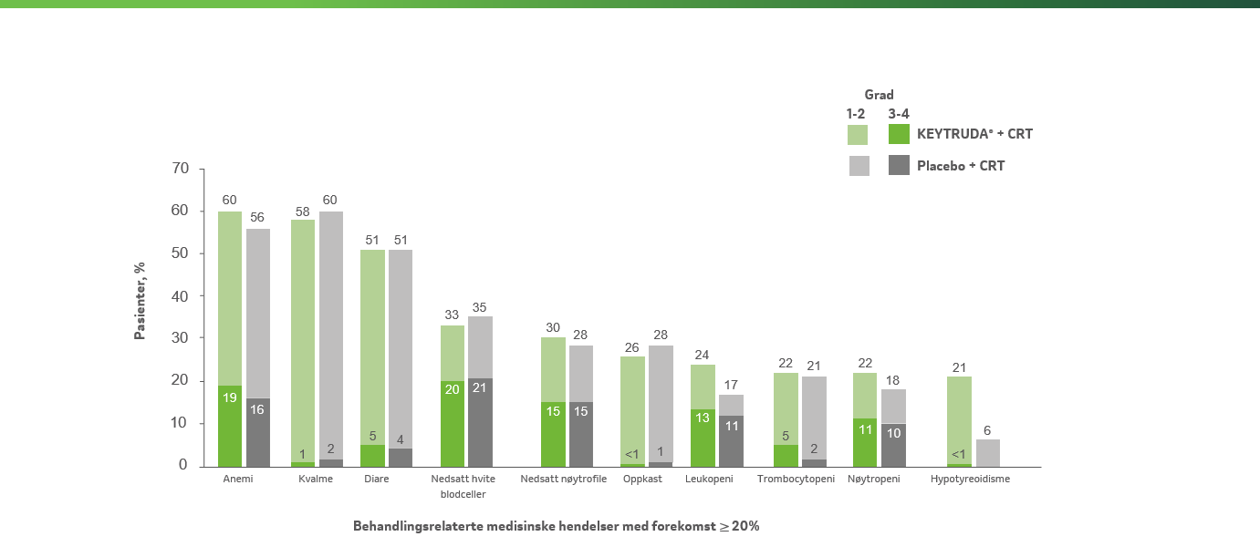 aGradert i henhold til NCI CTCAE v5.0. b Behandlingsrelaterte medisinske hendelser var hendelser som ble tilskrevet et av utprøvningslegemidlene av utprøverne. Behandlingsrelaterte medisinske hendelser som oppstod hos minst 20 % av pasientene i en av behandlingsarmene ble rapportert. Hendelsene er listet i synkende rekkefølge etter hyppighet i KEYTRUDA®–kjemoradioterapi-armen. Pasienter kan ha hatt mer enn én hendelse. Grad 5 behandlingsrelaterte medisinske hendelser var immunmediert gastritt (n=1) og perforasjon av tykktarmen (n=1) i KEYTRUDA®–kjemoradioterapi-armen, og benmargsvikt (n=1) og neutropen kolitt (n=1) i placebo–kjemoradioterapi-armen