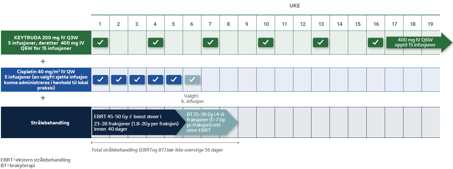 De første 5 syklusene ble det gitt enten KEYTRUDA 200 mg eller placebo hver tredje uke i kombinasjon med kjemoradioterapi, med 5 sykluser ukentlig cisplatin (40 mg/m2) + ekstern strålebehandling, etterfulgt av brakyterapi.