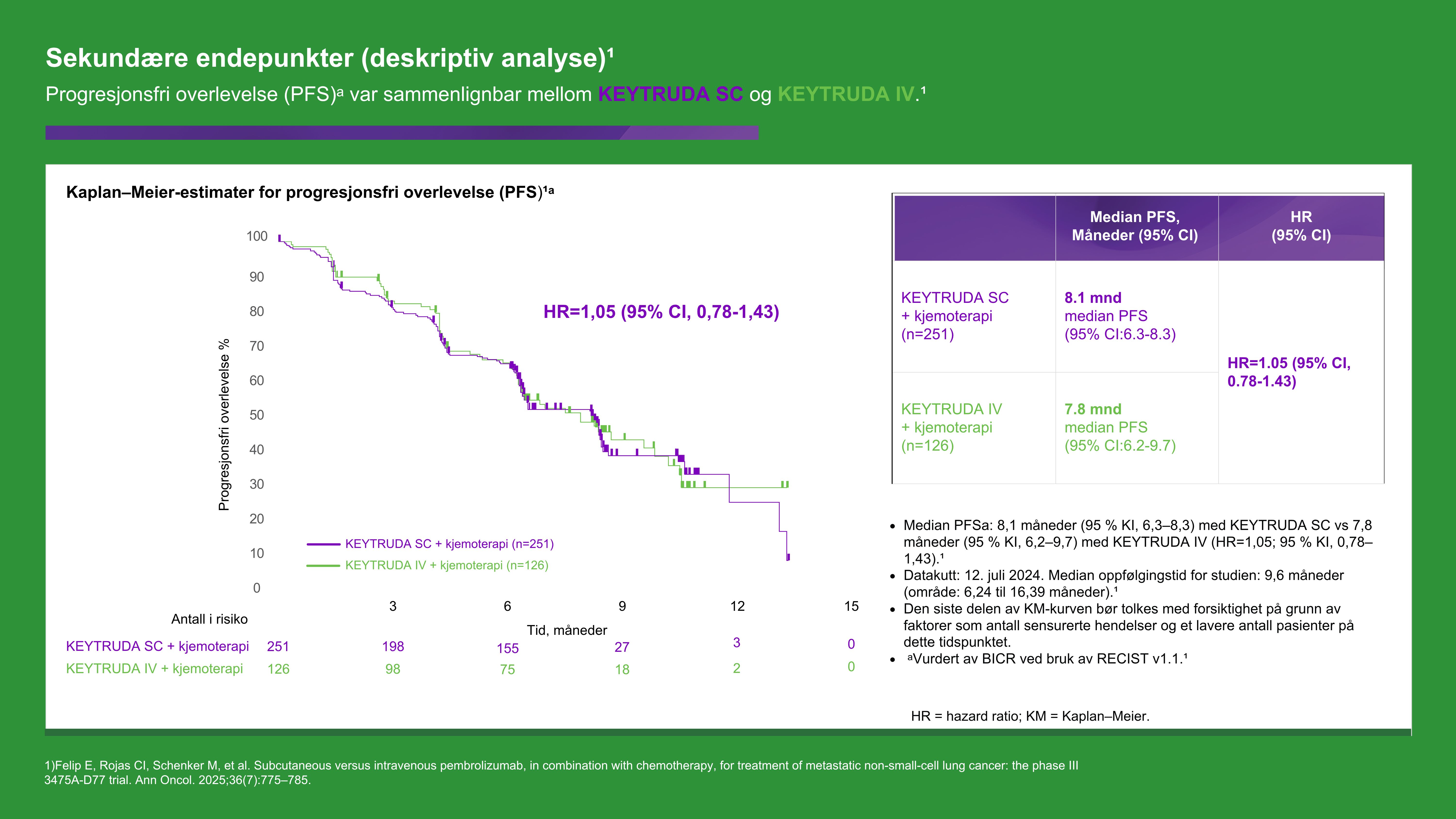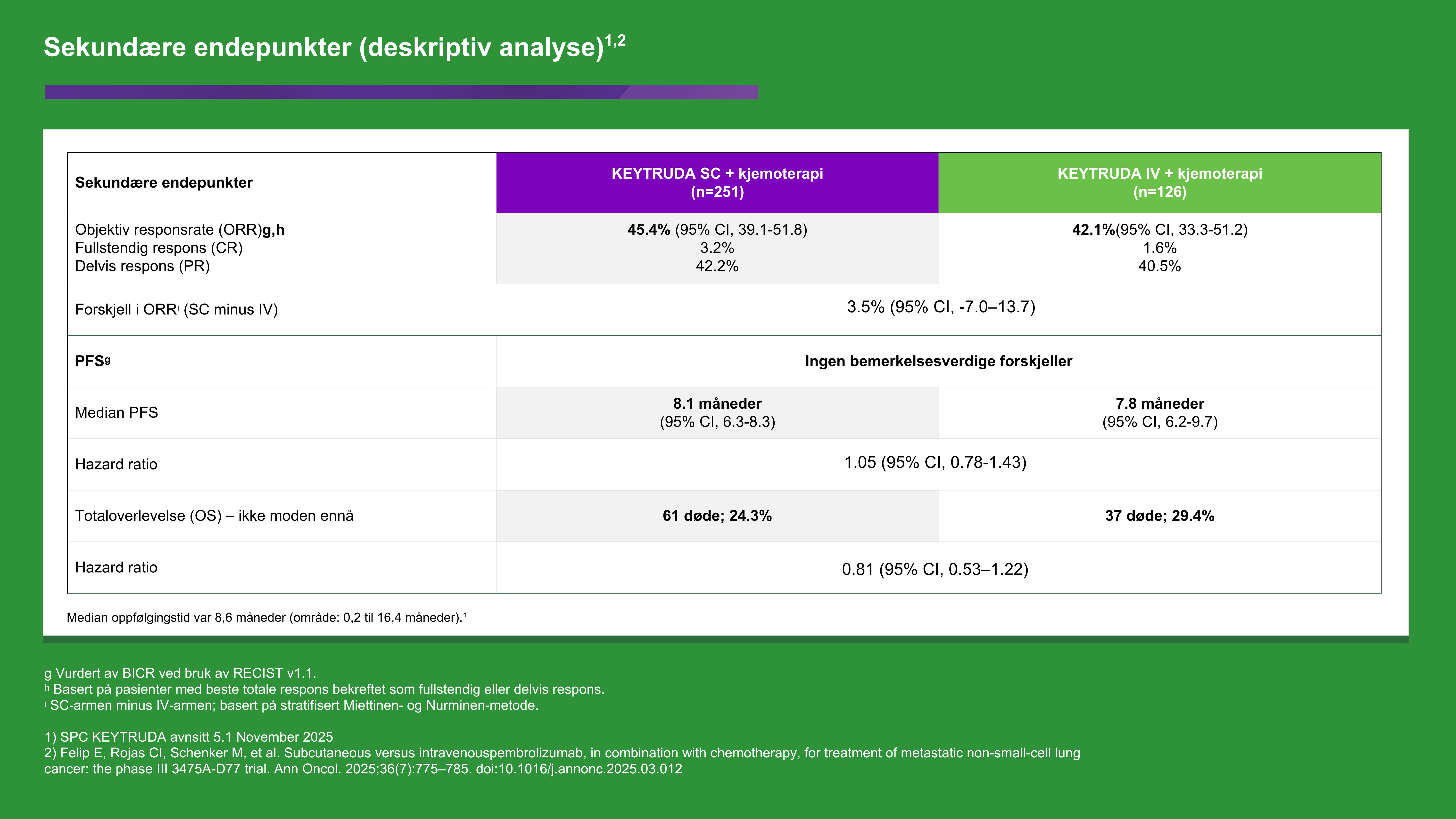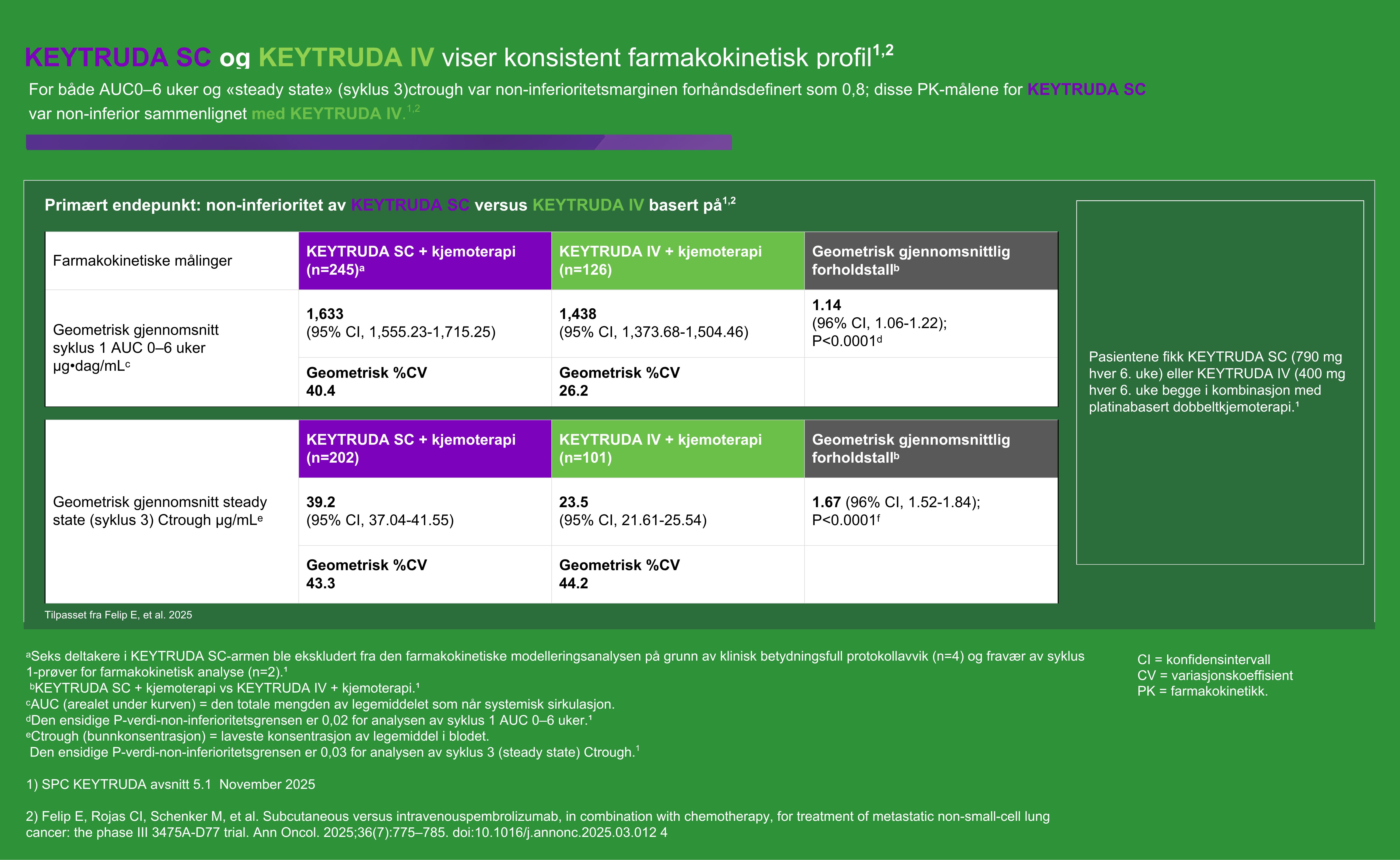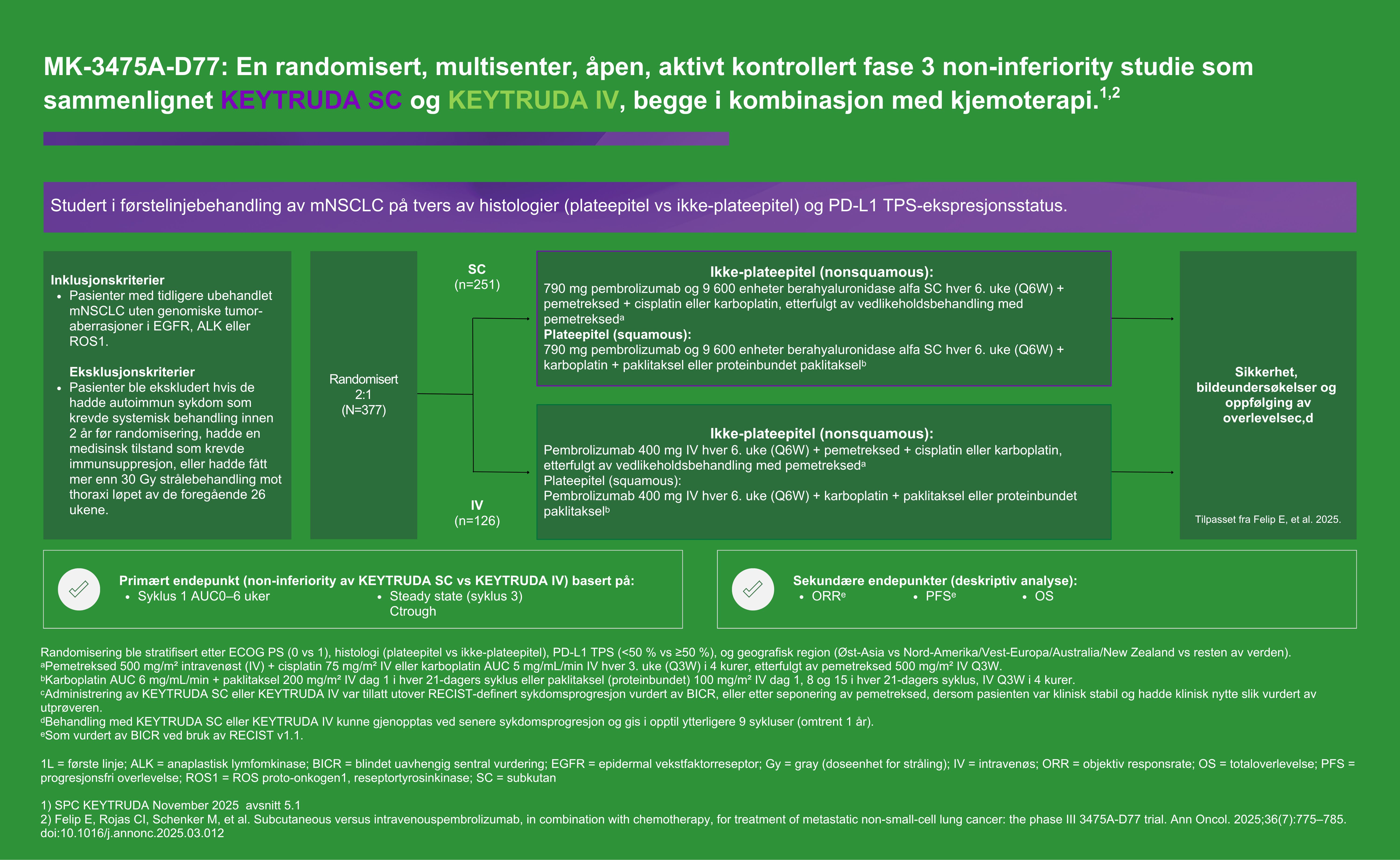 KEYTRUDA SC er godkjent basert på data fra studien MK3475-D77 som sammenlignet KEYTRUDA SC med KEYTRUDA IV, begge i kombinasjon med kjemoterapi.2 Les mer om studien her: