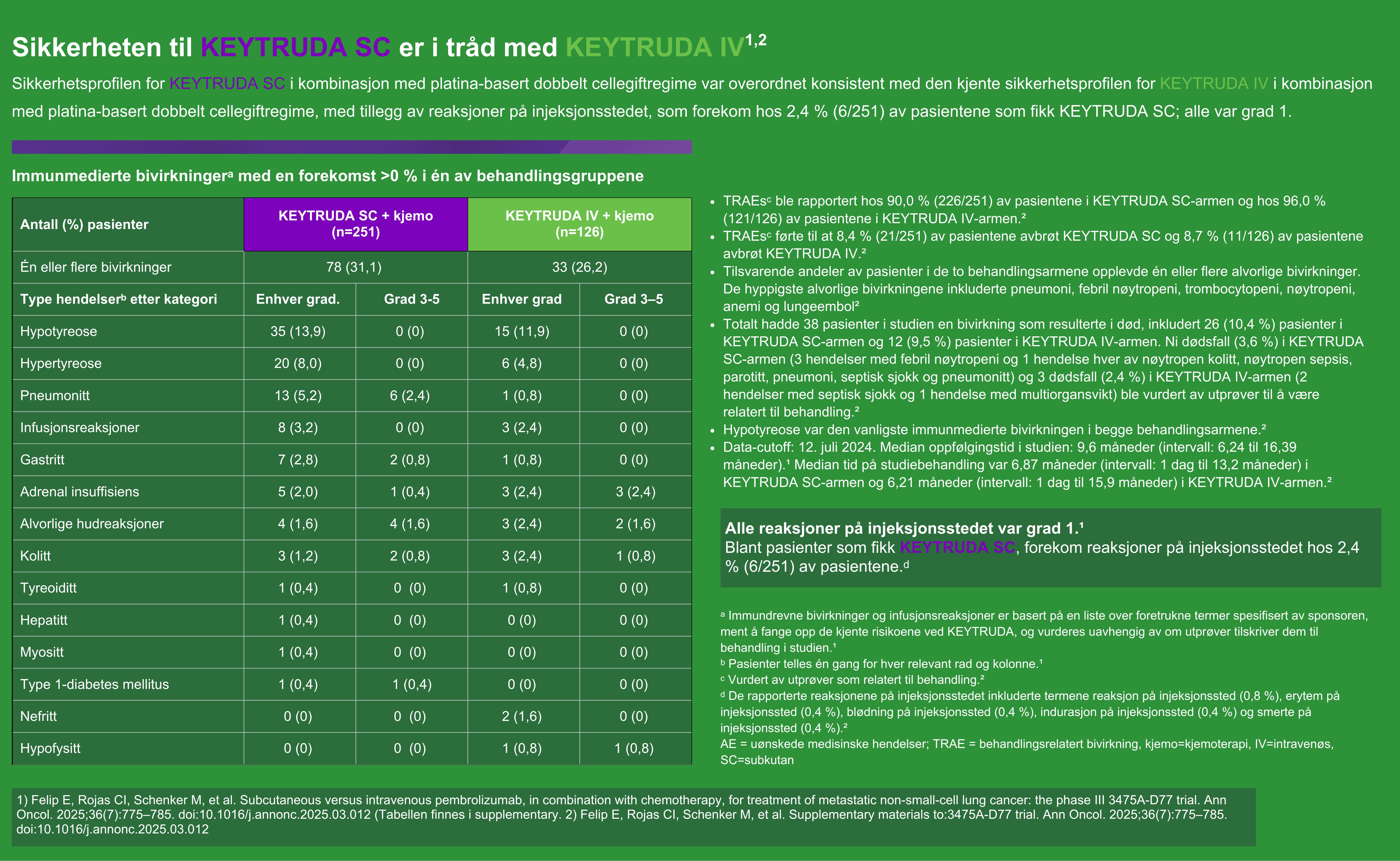 Det er samsvar i sikkerhetspofil mellom KEYTRUDA subkutan og intravenøs formulering. For mer informasjon, se KEYTRUDA sikkerhetsprofil/bivirkninger og sikkerhetsinformasjon fra studien MK3475-D77.