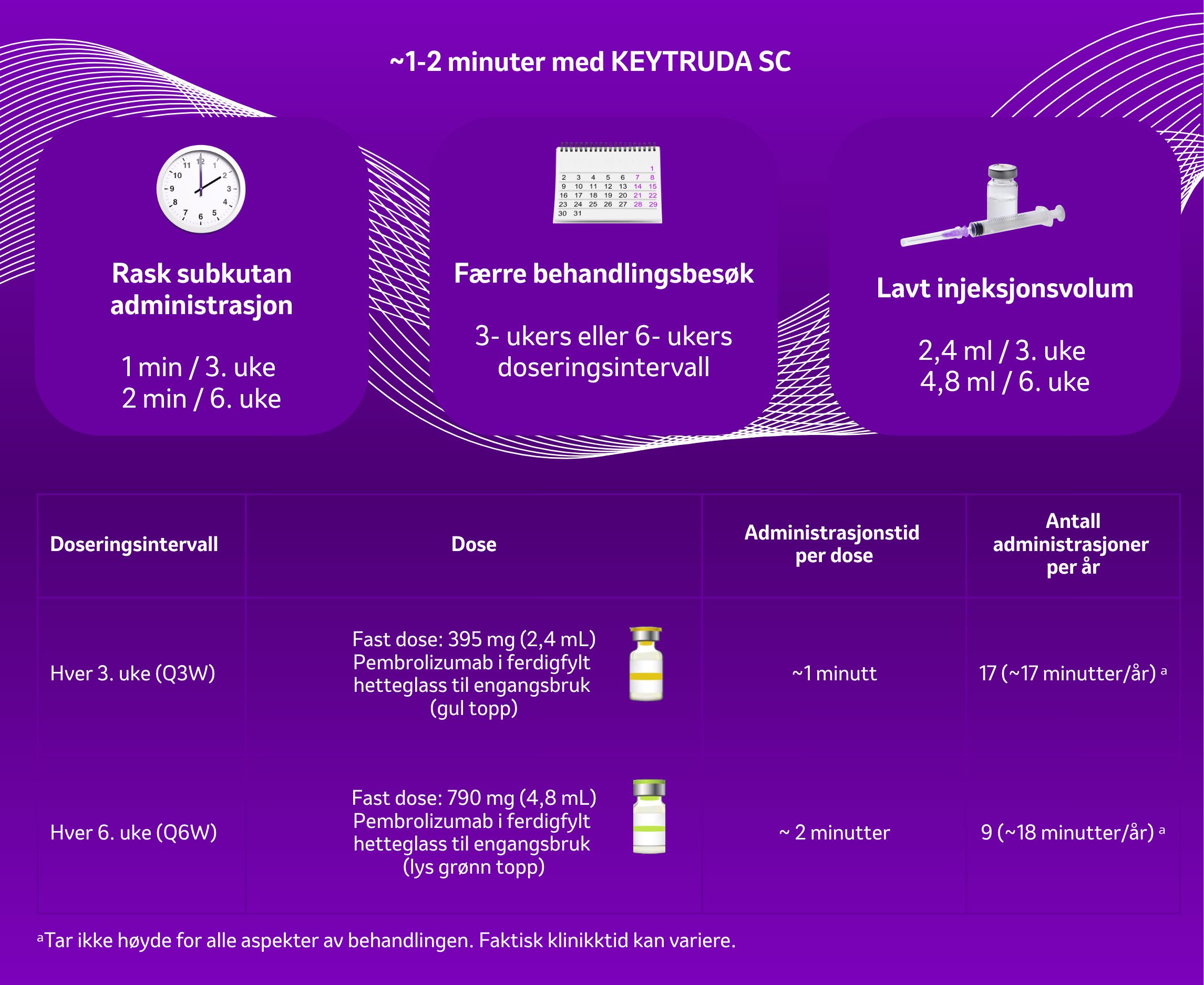 KEYTRUDA tilbyr en fleksibel dosering hver 3. uke eller hver 6. uke både i monoterapi og kombinasjon med annen behandling2. Den subkutane formuleringen administreres på 1–2 minutter og injiseres i abdomen eller låret. Behandlingen gis hver 3. uke (2,4 ml) eller hver 6. uke (4,8 ml).